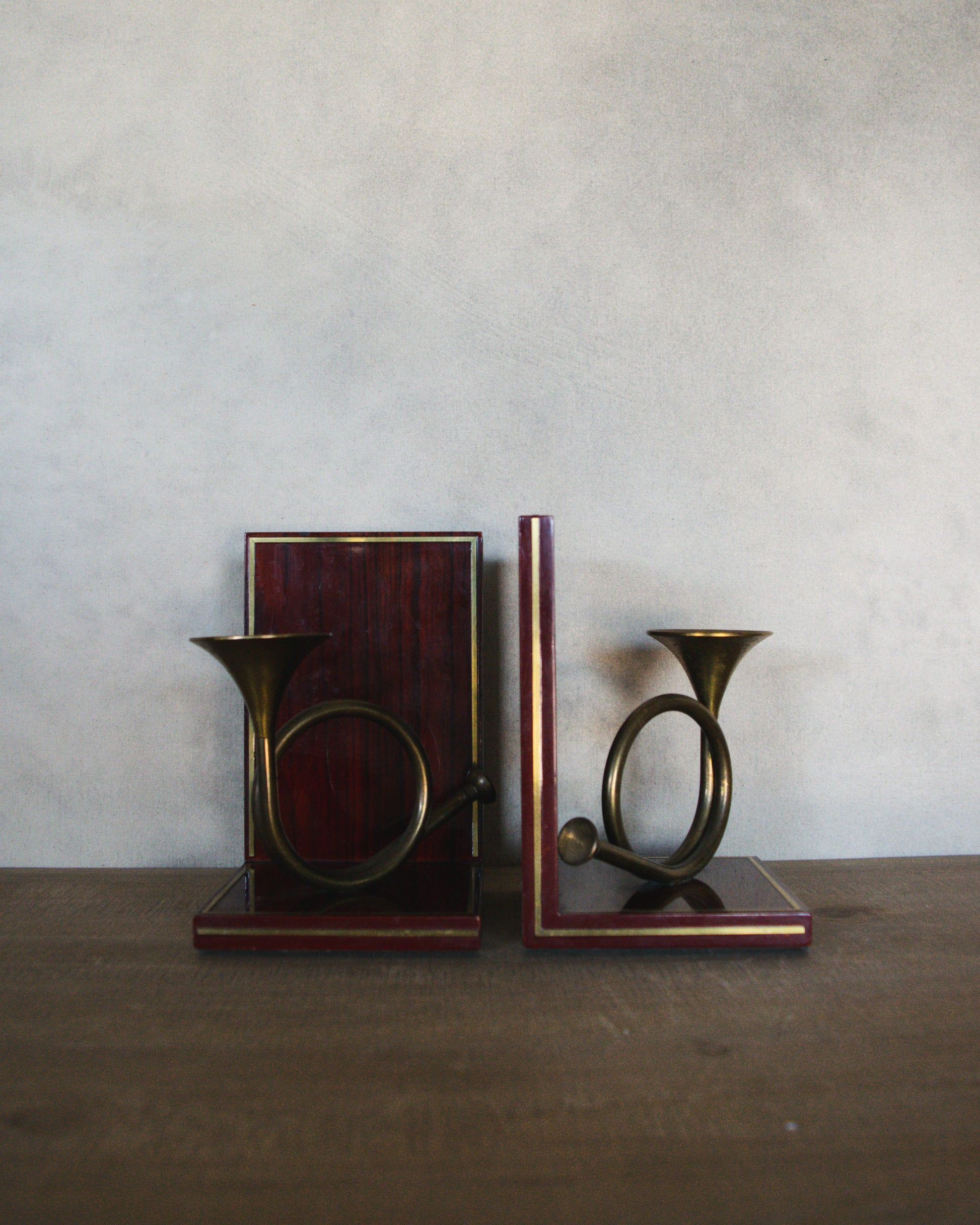 Vintage Pair of Wood and Brass French Horns Bookends
